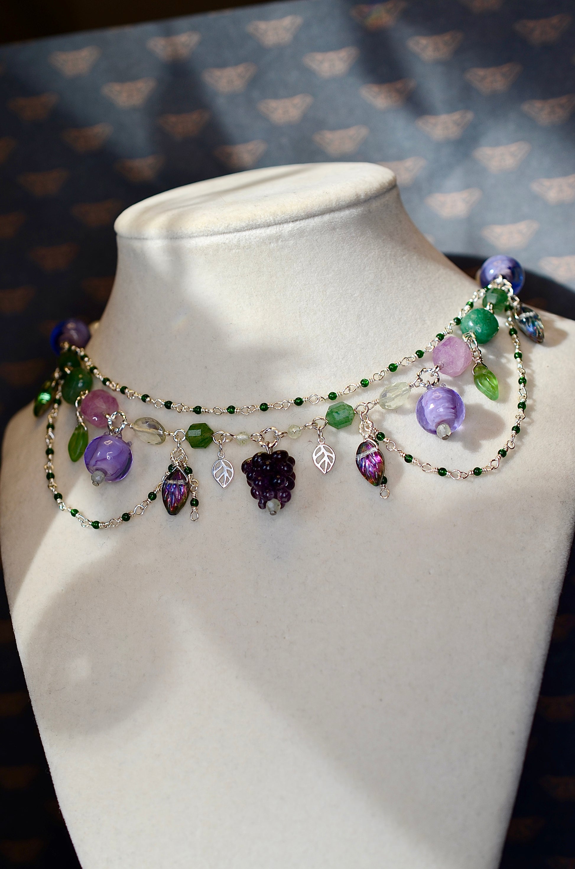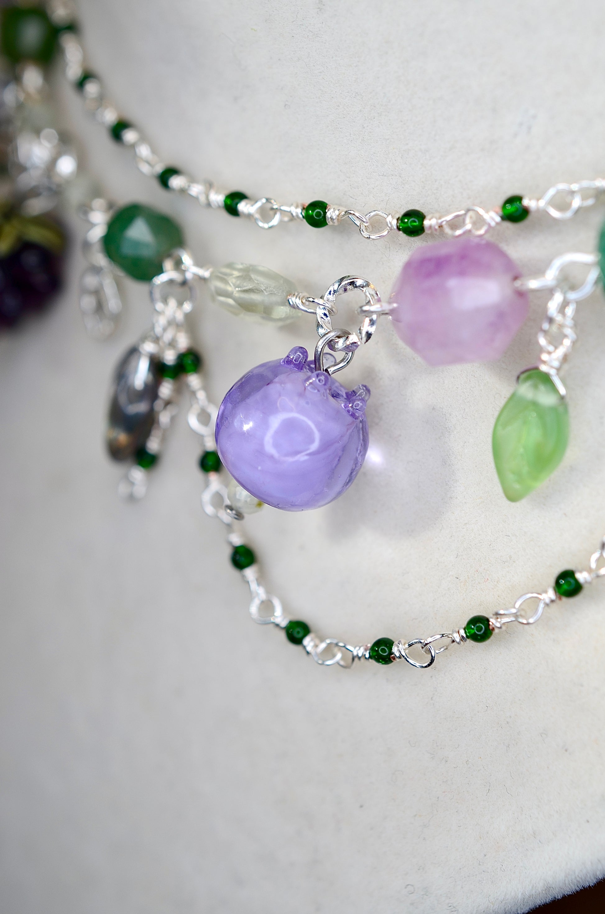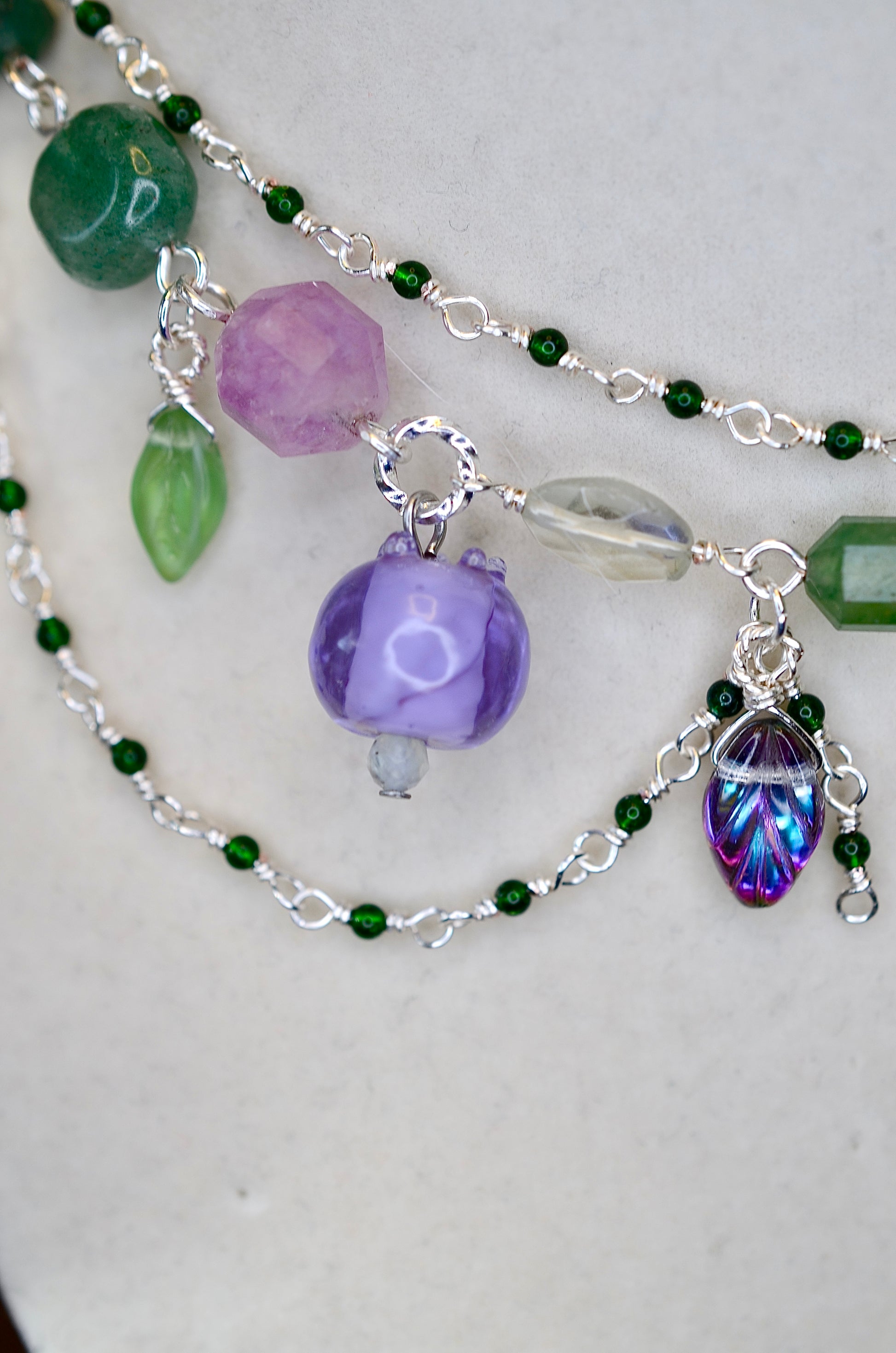 This whimsical necklace features dreamy lampwork glass berries, nestled among delicate glass leaves. Strung with soothing green aventurine and shimmering green goldstone, this piece combines artisan craftsmanship with natural stone energy. Crafted from sterling silver and silver-plated metals, it's both durable and elegant. The adjustable design ensures a perfect fit for any neckline, making it an easy reach-for favorite that brings a pop of botanical charm to your everyday style.