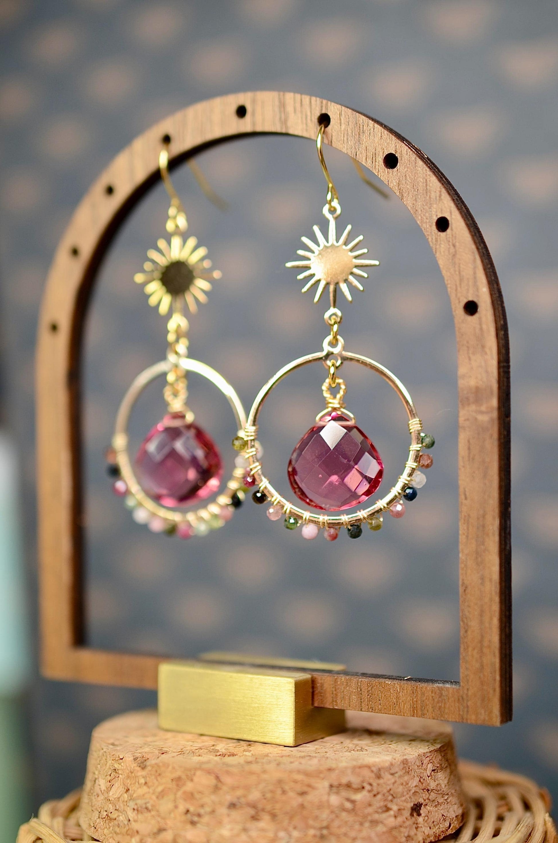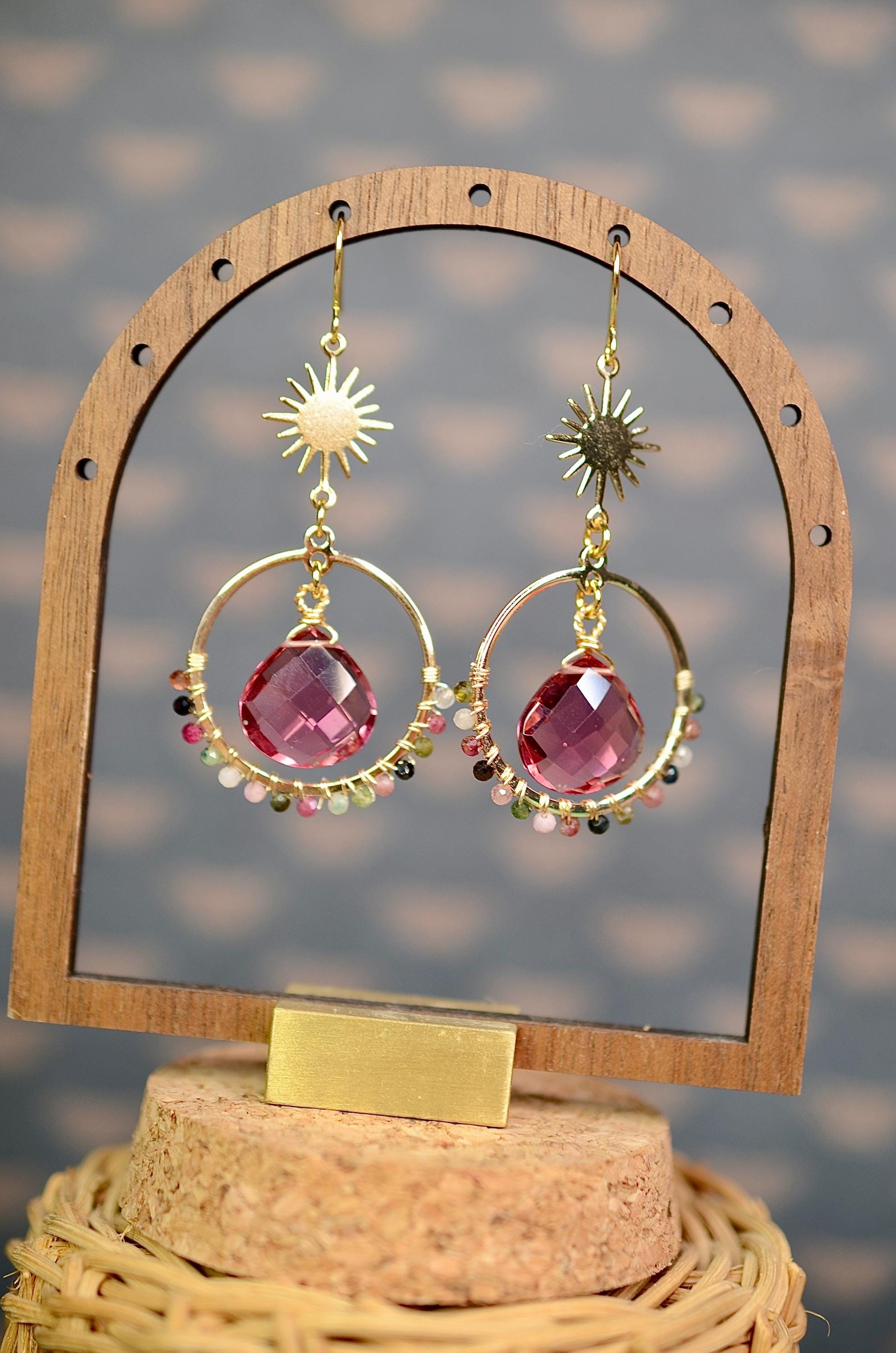 Gemstone Earrings: Tourmaline Stone, Celestial Earrings, Sun Charm, Wire Wrapped Jewelry